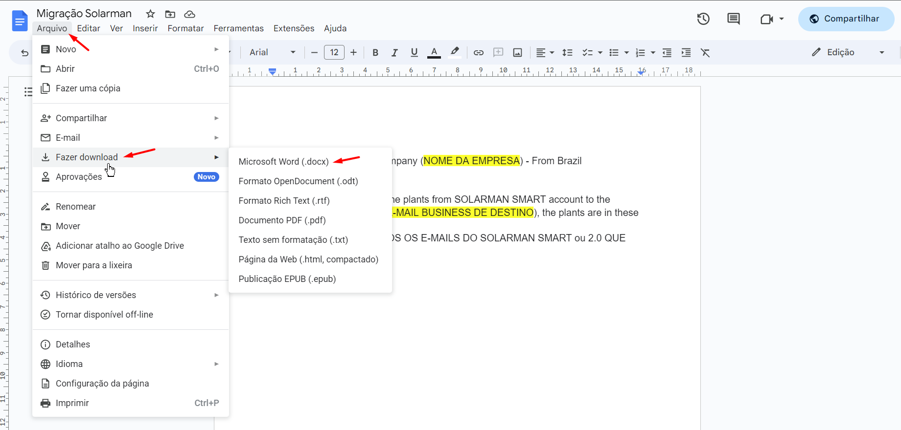 Após uma atualização do Solarman, os portais Solarman Smart e Solarman 2.0 foram descontinuados da nossa plataforma.Diante disso, para realizar a migração das suas usinas da conta do Solarman 2.0 para a conta do Business é necessário, primeiramente, baixar o seguinte documento:- Solicitao Solarman - Documentos Google Para baixá-lo, é necessário fazer da seguinte forma:- Preencha os dados entre parênteses, copie o texto e coloque em anexo no corpo do e-mail que deve ser encaminhado para: customerservice@solarmanpv.com