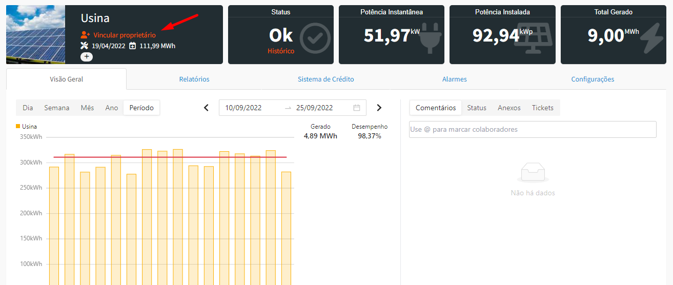 Na página da usina, clique em 'Vincular proprietário'