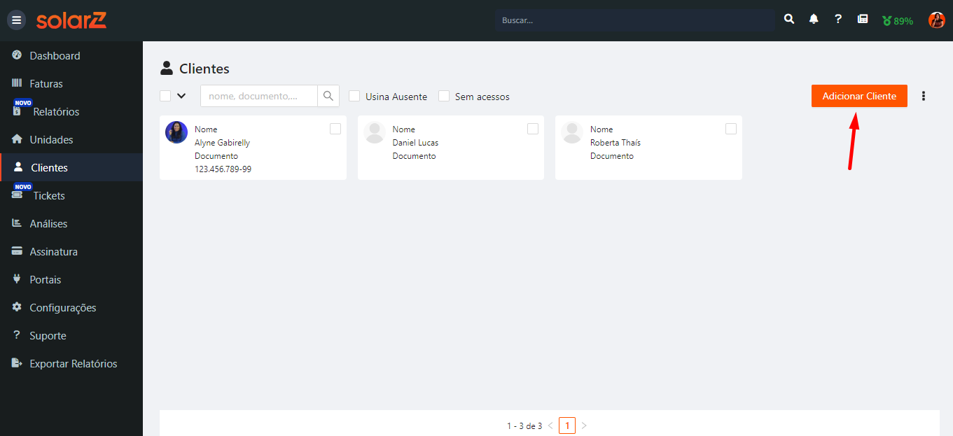 Selecione no menu a opção 'Clientes' e, em seguida, clique no botão de 'Adicionar Cliente'