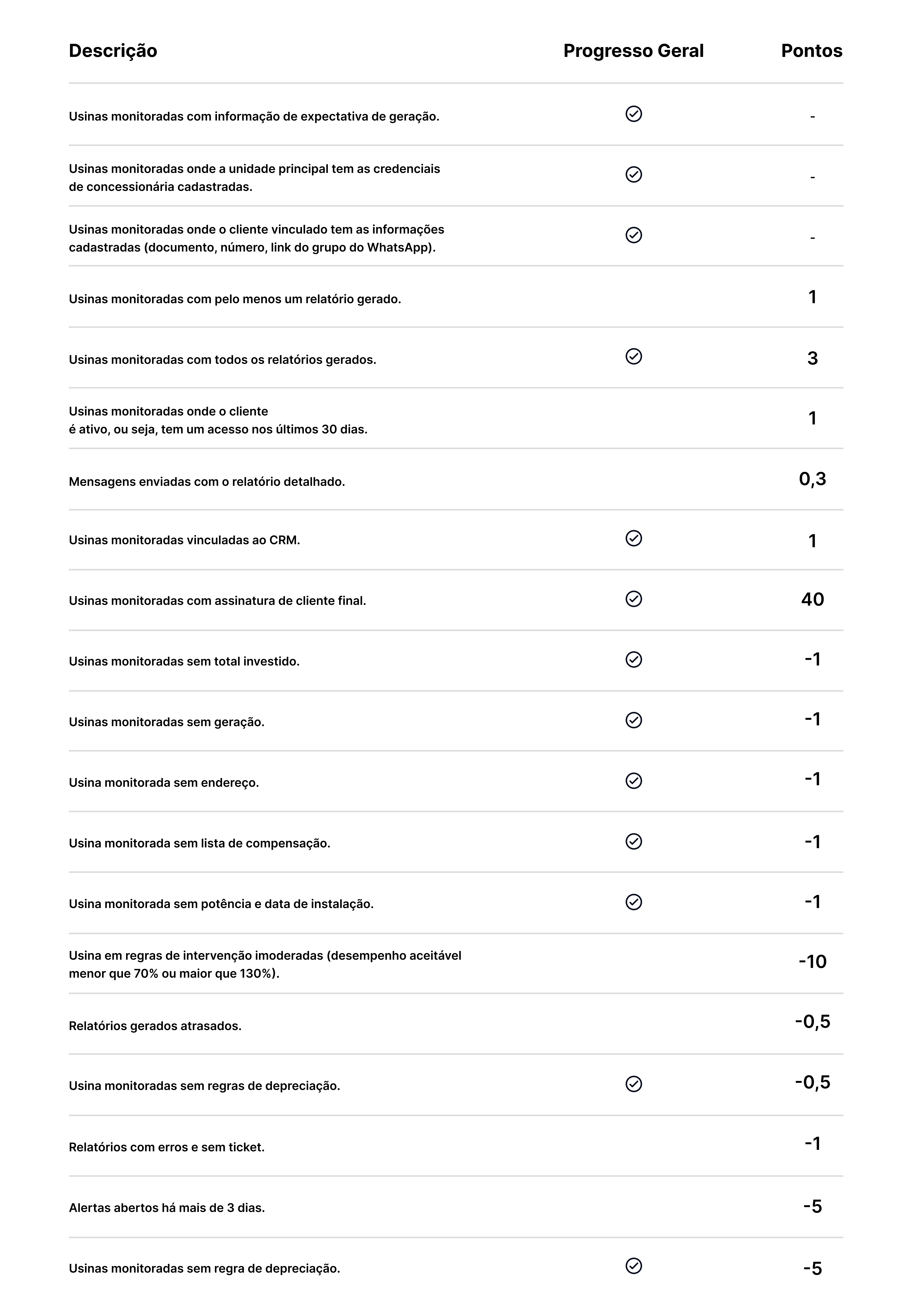 Por exemplo: se um integrador monitora 50 usinas e deveria ter 150 informações registradas (como total investido, relatórios etc.), mas registrou apenas 75, seu progresso geral serÔ de 50%.